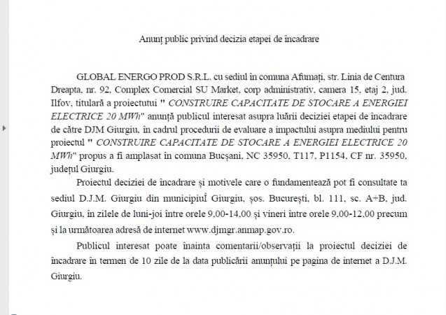 Anunț public privind decizia etapei de încadrare