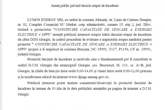Anunț public privind decizia etapei de încadrare Posted in: Actualitate, Administratie Tags: anunt, mediu Giurgiu