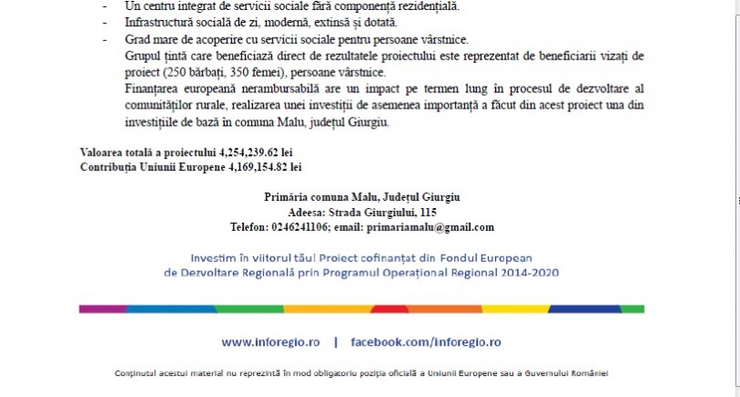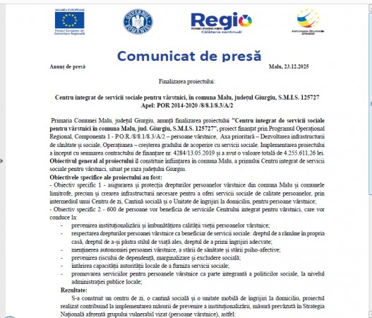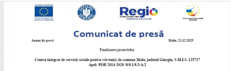 Comunicat de presa- Finalizarea proiectului: Centru integrat de servicii sociale pentru vârstnici, în comuna Malu, județul Giurgiu, S.M.I.S. 125727- Apel: POR 2014-2020 /8/8.1/8.3/A/2