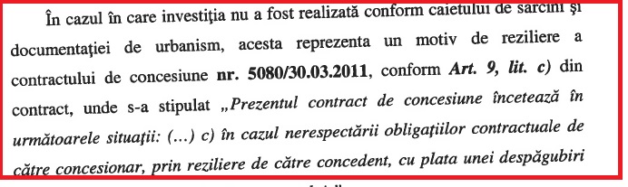 Contractul de concesiune prevede clar: ” Prezentul contract de concesiune încetează în următoarele situații: (…) c) în cazul nerespectării obligațiilor de către concesionar, prin reziliere de către concedent, cu plata unei despăgubiri juste calculate la data rezilierii contractului.”