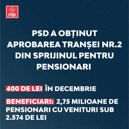 După ce am reuşit să impunem menţinerea măsurii privind plafonarea adaosului la alimentele de bază, avem o nouă veste bună. Peste 2.750.000 de vârstnici – a căror pensie este sub valoarea salariului minim net de 2.574 de lei – vor primi a doua tranşă a sprijinului în valoare de 400 de lei.