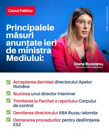 Posted in: Actualitate, Administratie, Politica Tags: Diana Buzoianu, ministerul mediului, USR✅ Acceptarea demisiei directorului Apelor Române și numirea unui director interimar din cadrul instituției ✅ Trimiterea raportului Corpului de control la Parchet ✅ Demiterea directorului ABA Buzău Ialomița ✅ Demararea procedurilor pentru desființarea ESZ ✅ Convocarea CA al ESZ pentru măsuri în urma raportului Corpului de control 👉 Premierul a fost informat cu privire la […]