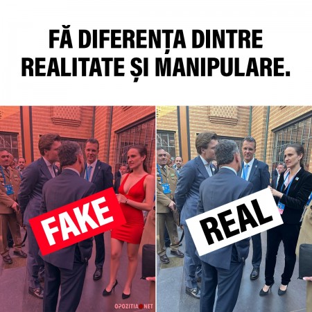 În poza reală (din dreapta), Oana Țoiu era la summit-ul NATO de la Haga, unde discuta cu partenerii despre apărare, inclusiv in fața atacurilor de tip hibrid într-un context în care frecvența utilizării campaniilor de dezinformare bazate pe informații și imagini false crește.